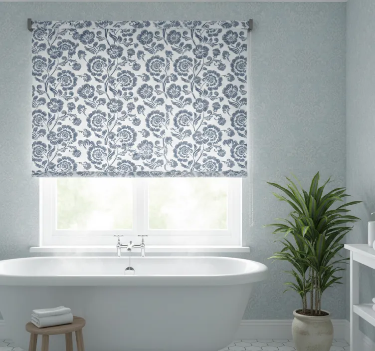 Bathroom Blinds with blue flowers on a white background, available in light filtering, voile, or blackout fabrics. Easy to mount and remove with wall-ceiling or recess installation, providing privacy, light control, and a fresh decorative touch.