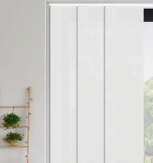 China White Panel Blinds in plain polyester fabric provide dim out light control for complete privacy. Extra wide panels suit large windows and doors, combining practical shading, smooth operation, and a clean, modern look for kitchens, offices, and living spaces.