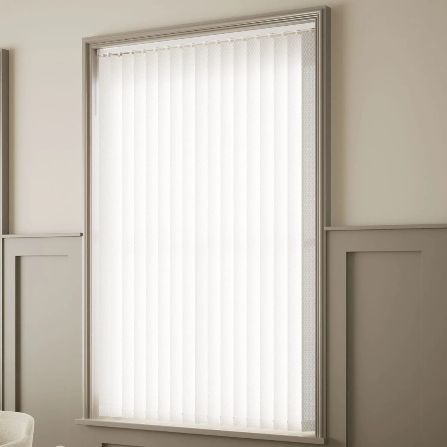 Crisp white vertical blinds with subtle diamond texture. Adjustable louvres provide light control and privacy, ideal for kitchens, bathrooms, and modern interiors.