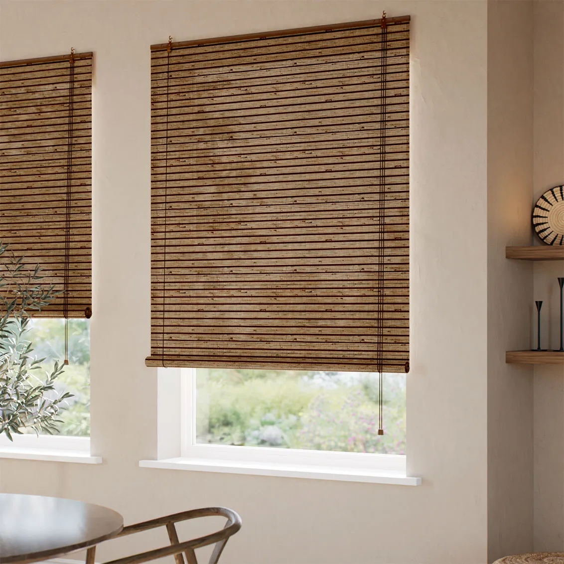 Rustic yet sophisticated roll-up blind crafted from bamboo and jute. Its striped pattern with intricate threadwork adds texture and warmth, fully custom-made for effortless light control and natural elegance in any room.