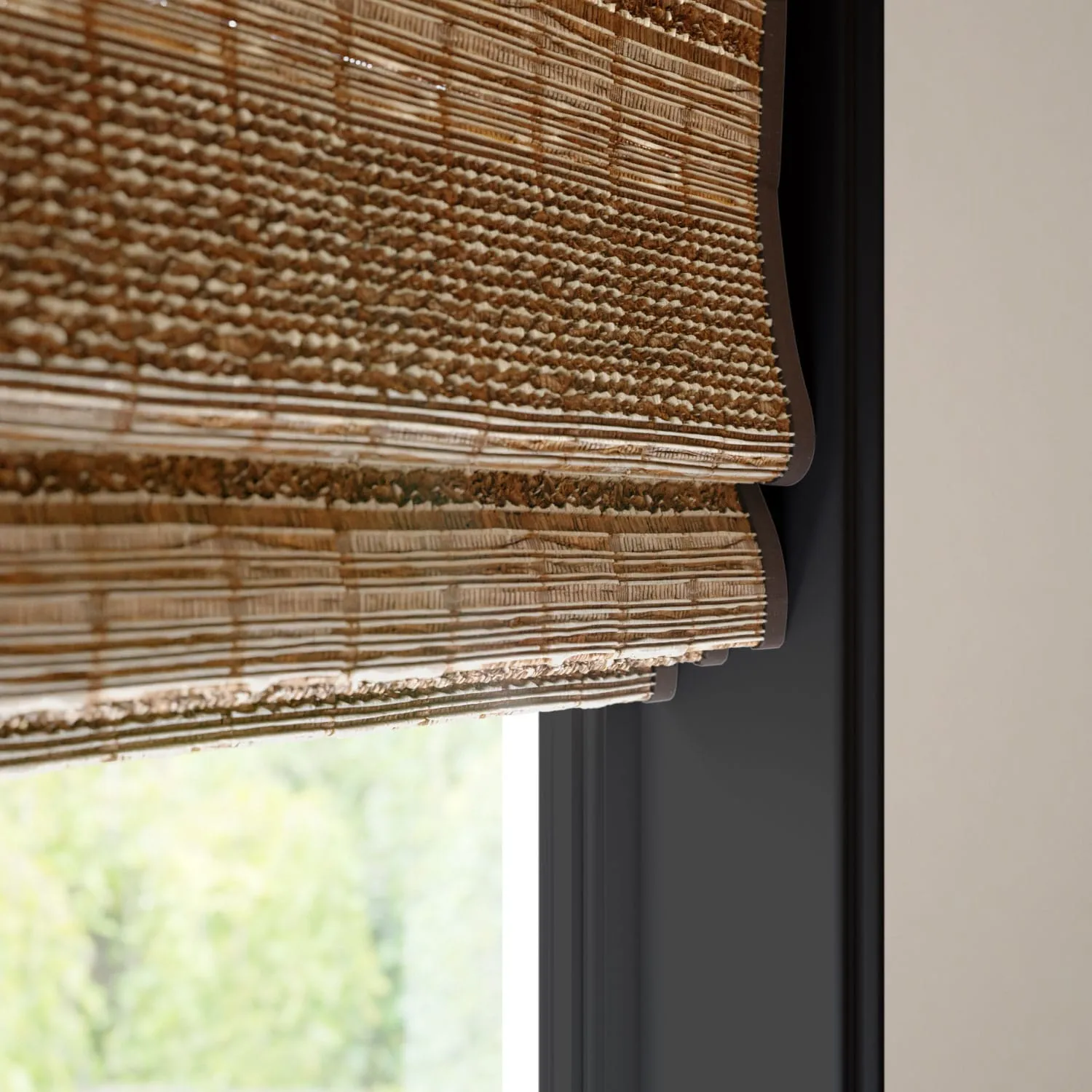 Natural bamboo and jute woven Roman blind with dark brown border. Fully custom-made, unlined or blackout options, motorisable for effortless operation, bringing rustic sophistication and biophilic style to any interior.